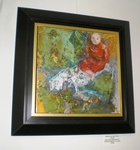 1999Een schilderijtje over de rode trui,magie. In aluminium- goudkleurige smalle houten lijst, achter glas
