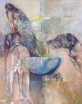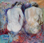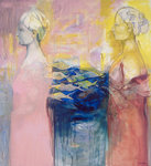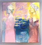 1999Subject: onderlinge aanvoelende verstandhouding tussen vrouwen. Acrylverf, modelingpaste en contekrijt op linnen in alukleur houten lijst. Aangekocht door een kunstenaar