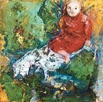 1999Joey, mijn hond, in Óbidos te Portugal. Acrylverf met een beetje paarlemoerverf op linnen,in zijdeglans witte houten lijst 30x35